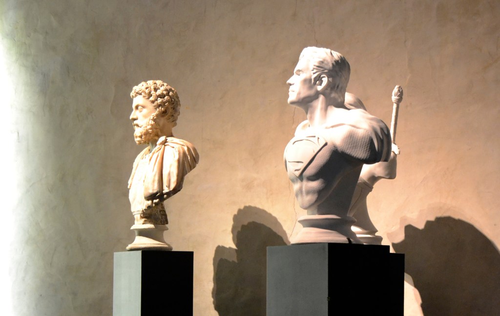 Illustration 1. L’Antiquité se retrouve dans la culture populaire. Le buste de Marc Aurèle (MSR) est présenté aux côtés des bustes de Supers-héros comme Superman(Léo Caillard). Scénographie et photo de Guillaume Lamarque, Février 2019.