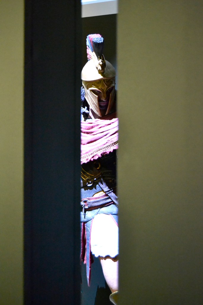 Illustration 5. Le plan des espaces et la disposition des cloisons laissent place à la découverte, par moment partielle du contenu de l’exposition, comme cette ouverture dans une cloison laissant apparaître la statue d’Alexios, un personnage du jeu Assassin’s Creed Odyssey, par Ubisoft (2018). Scénographie et photo de Guillaume Lamarque, février 2019.