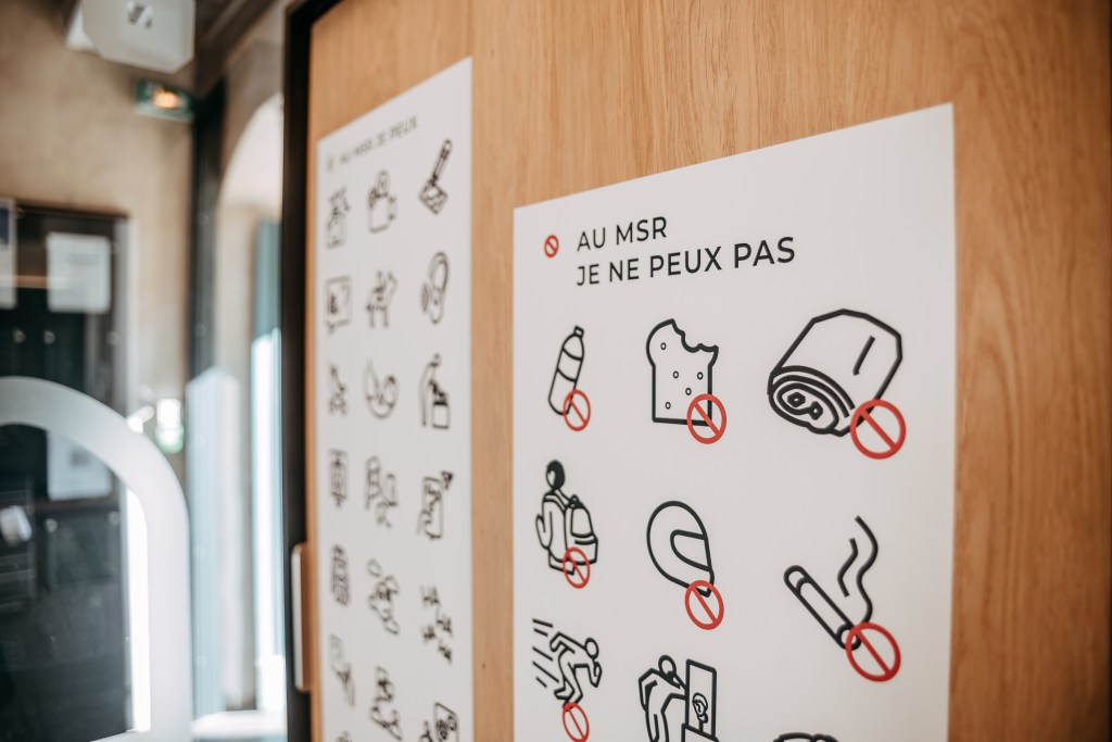 La singularité du MSR, mêlant les références de l’Antiquité et de la culture populaire, s’incarne aussi par la signalétique. L’humour est subtilement présent dans le lot des pictogrammes de ce que l’on peut faire ou non au musée d’archéologie de Toulouse.