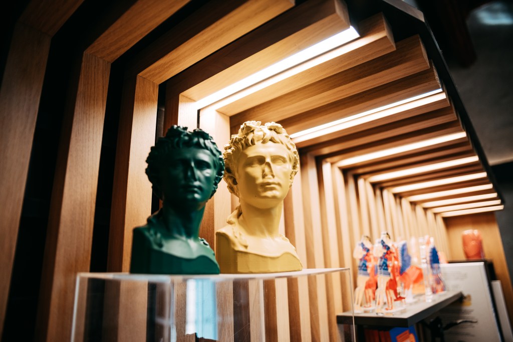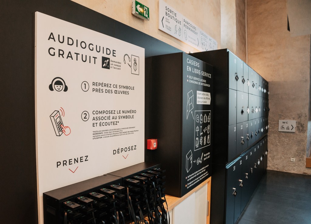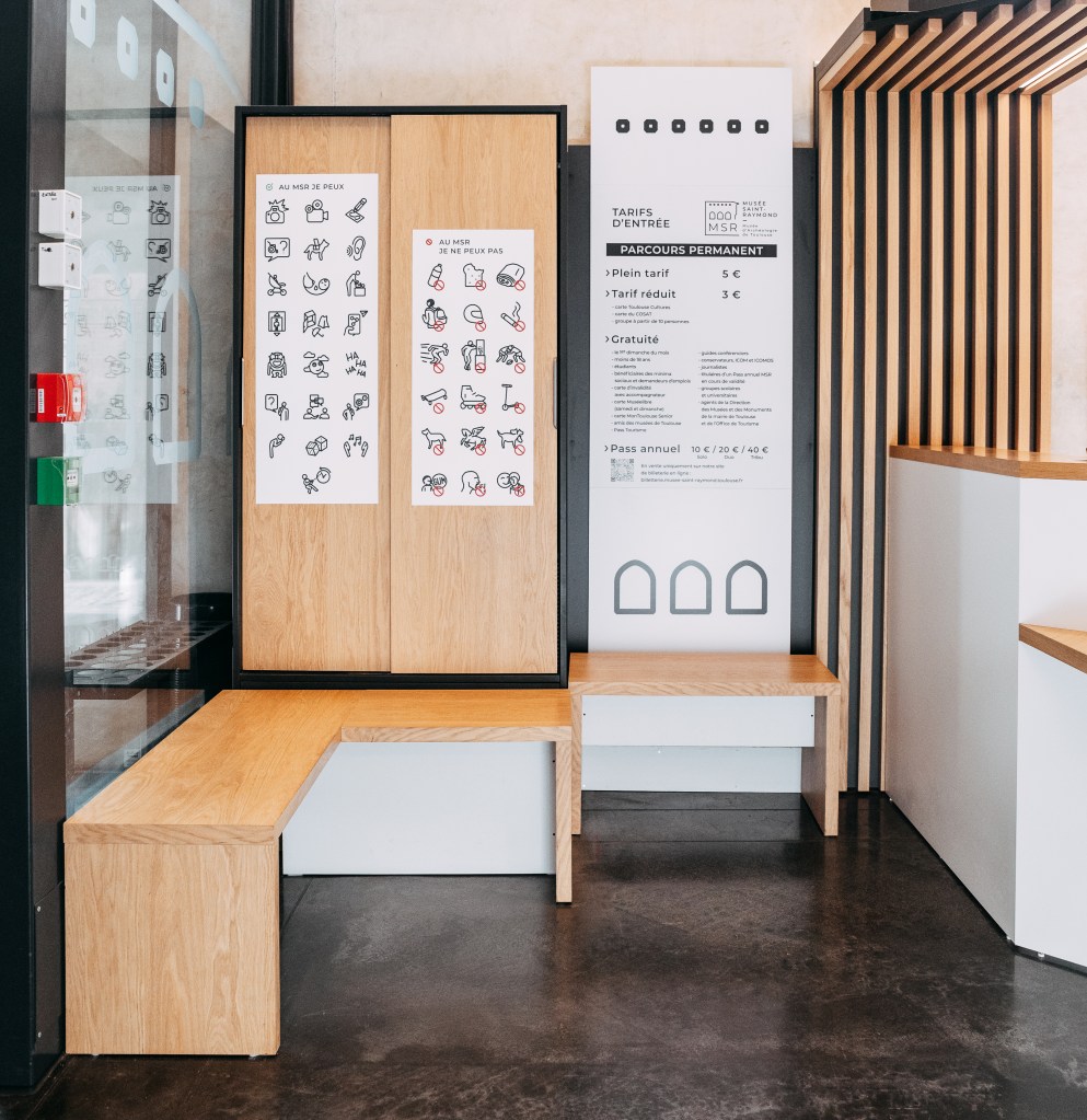 Tous les codes visuels liés aux espaces et services sont singuliers au Musée Saint-Raymond : les casiers gratuits en libre service permettent de ranger son manteau, son parapluie ou sa cape de super-héros.